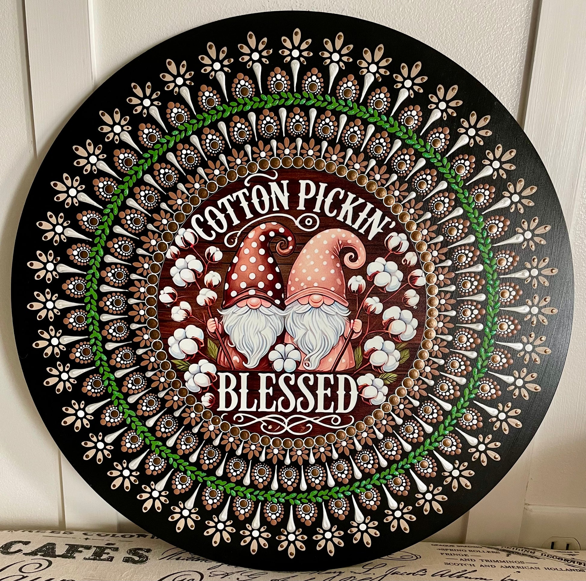 This is a 16 inch wood round with an 8 inch metal sign in the center. It is then hand painted around the sign and sprayed with a satin sealer. There’s a saw tooth hanger on the back.